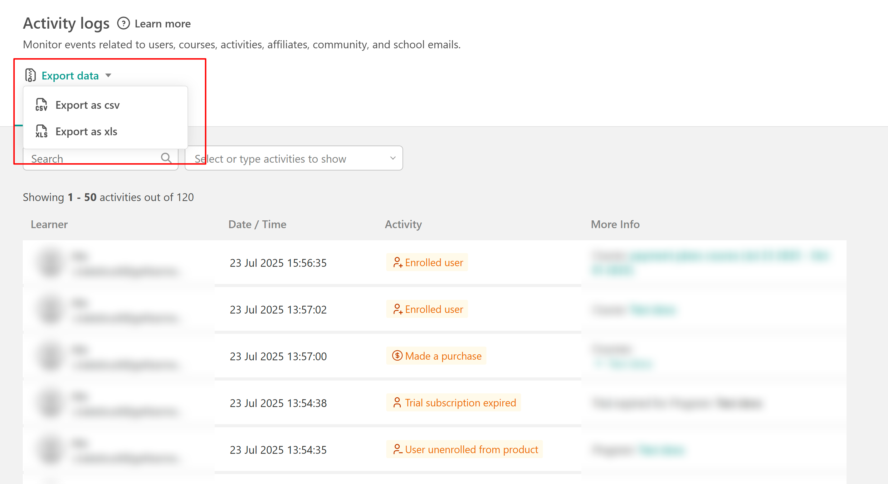 2. Or click See all on the Events Log section of your Dashboard to identify login activity, failed purchases, course enrollments, and a lot more.