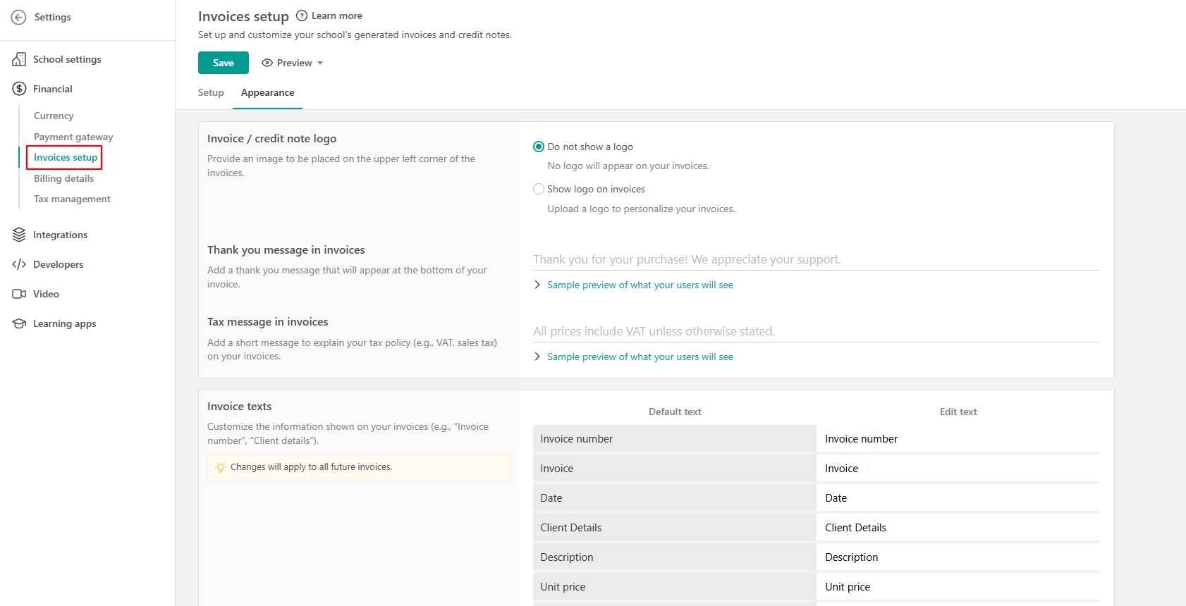 Begin customizing your invoices/ credit notes by navigating to Settings → Financial → Invoices Setup.