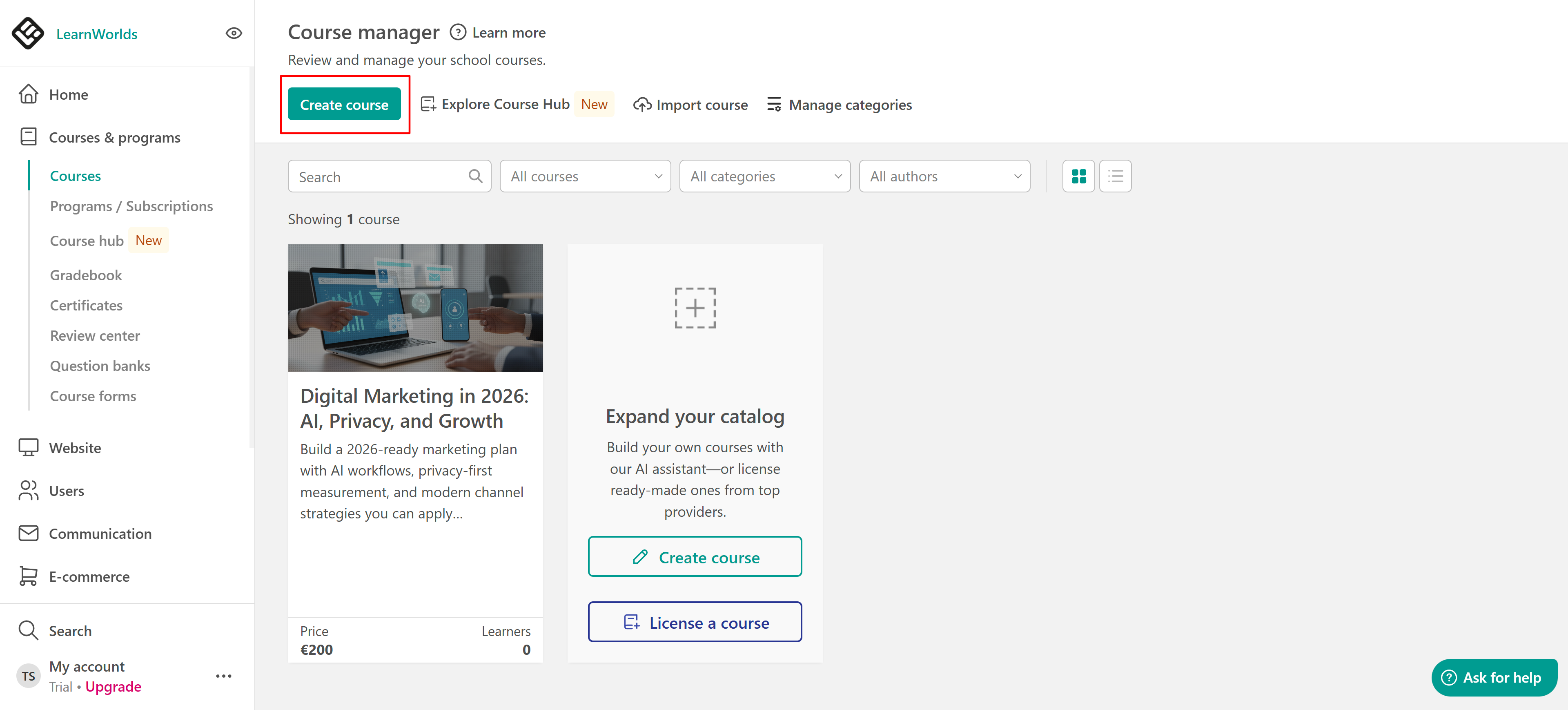 2. Navigate to Courses & Programs → Courses and click Create course.