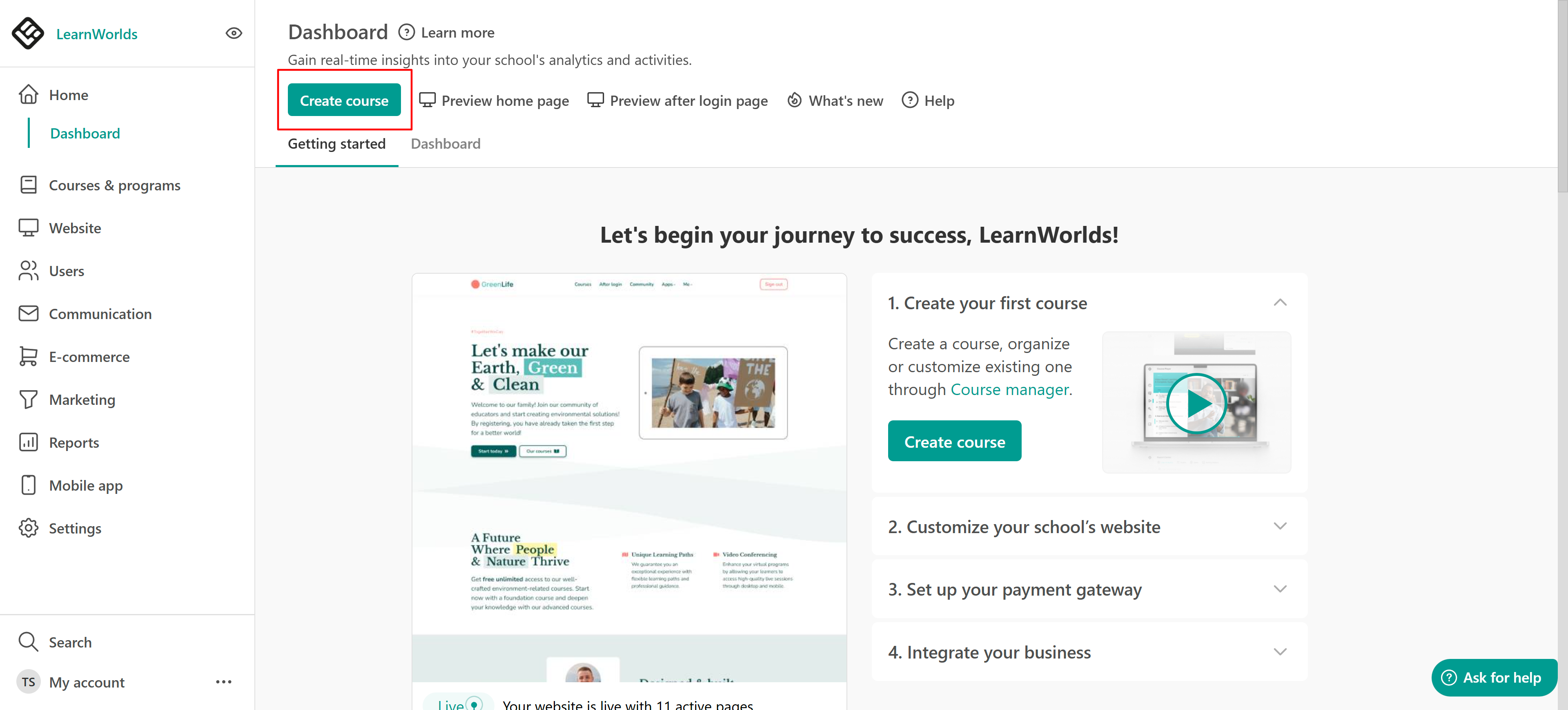 1. From the main admin dashboard, click on Create course.