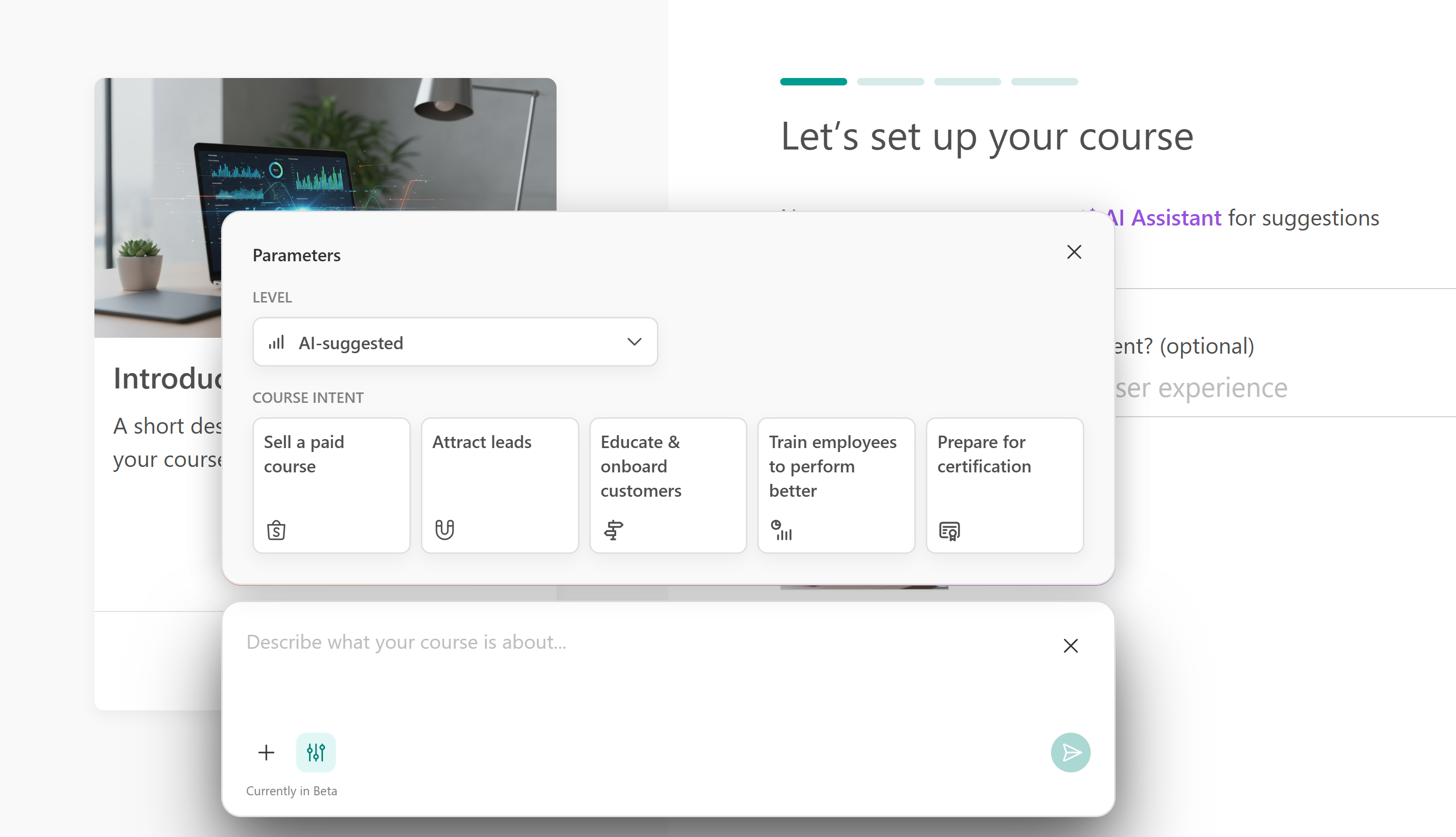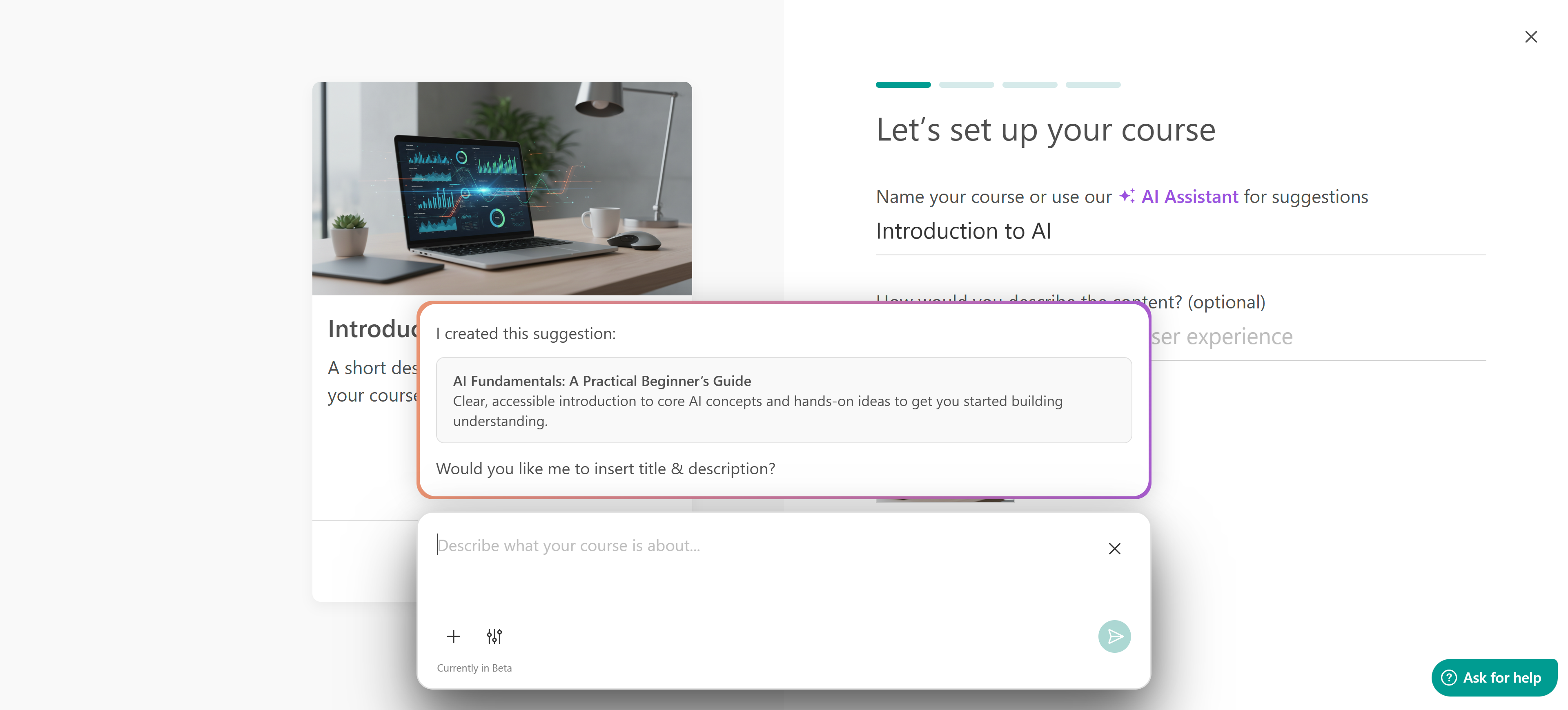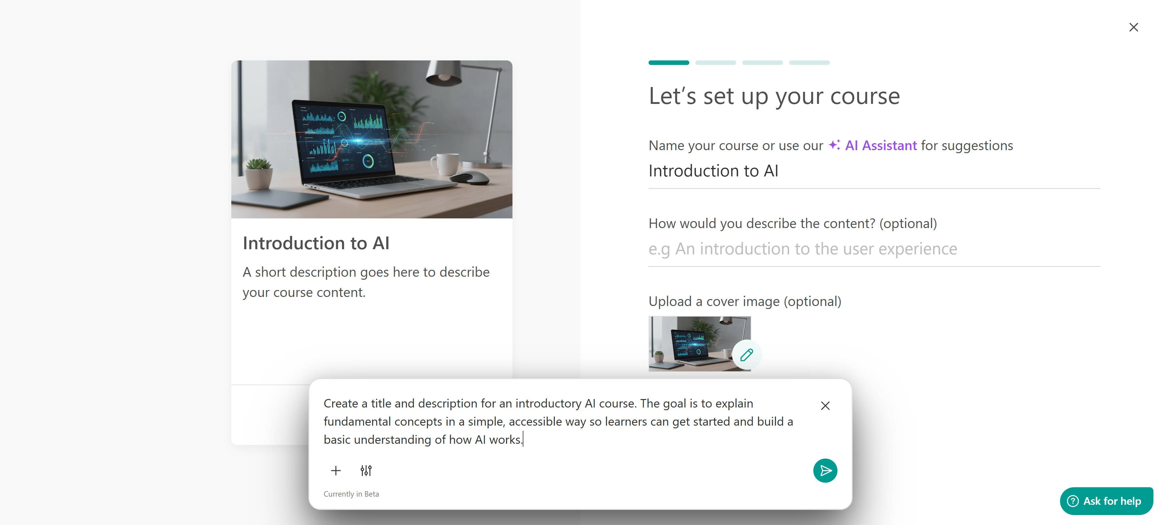 You can use the AI Assistant to help craft your title and description. Click on the Assistant and provide the necessary details, like what users will gain after the course, the course level, and tone of voice.
