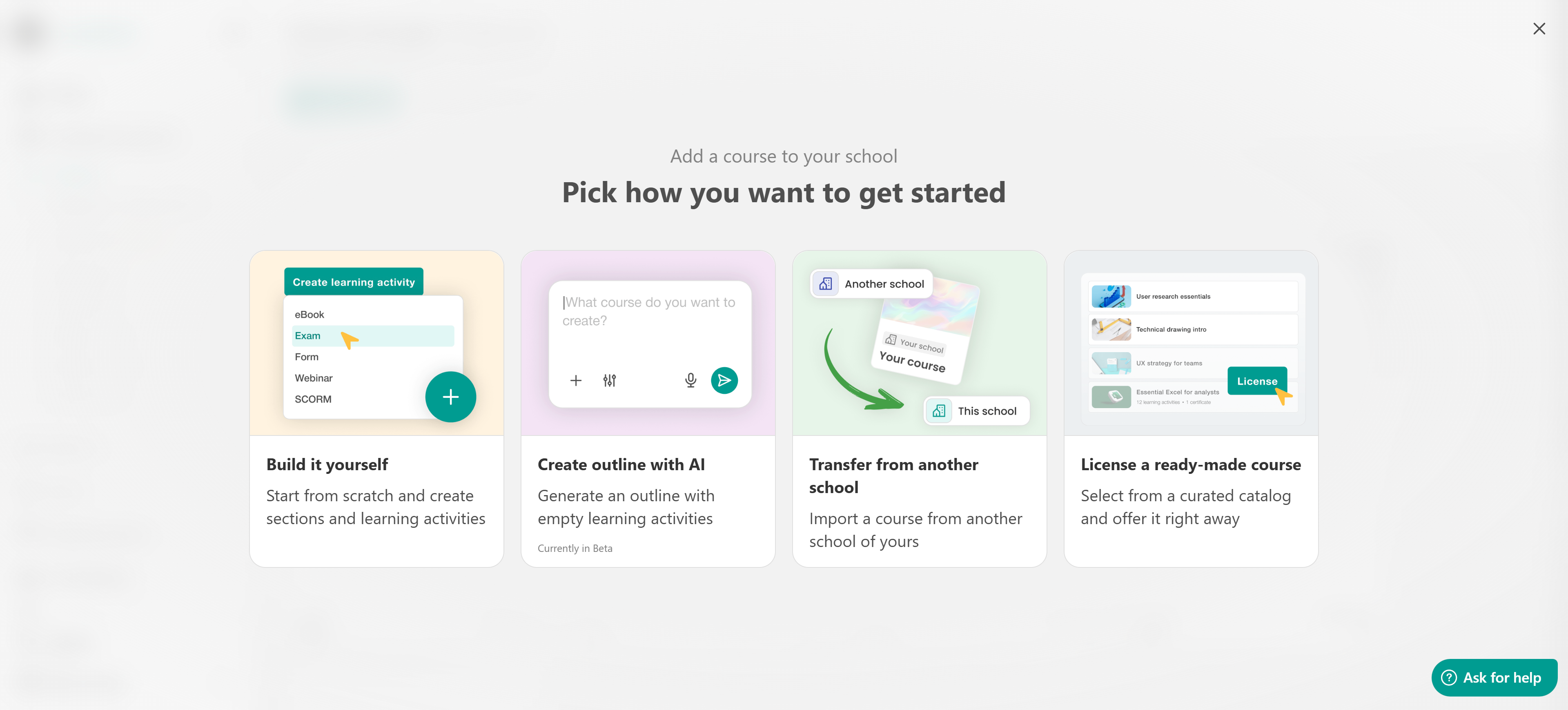 Choose how you’d like to get started: build your course from scratch, use AI to generate an outline, import a course from another school, or select a ready-made course to license from the course hub.