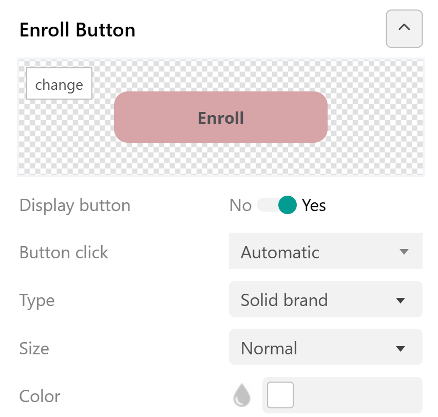 - Enroll button: Here, you can choose whether to display the Enroll button and define how it behaves. When clicked, it can either direct users straight to the payment page (automatic) or follow the action set in the course card’s “When clicked” setting.
