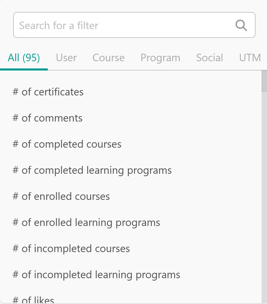 b. Course: You can find any filter related to the users’ interaction with a course.'