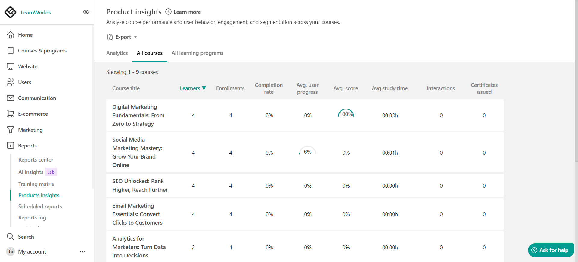 1. Navigate to Reports Center → Products Insights or to the course insight tab inside any course of your choice.