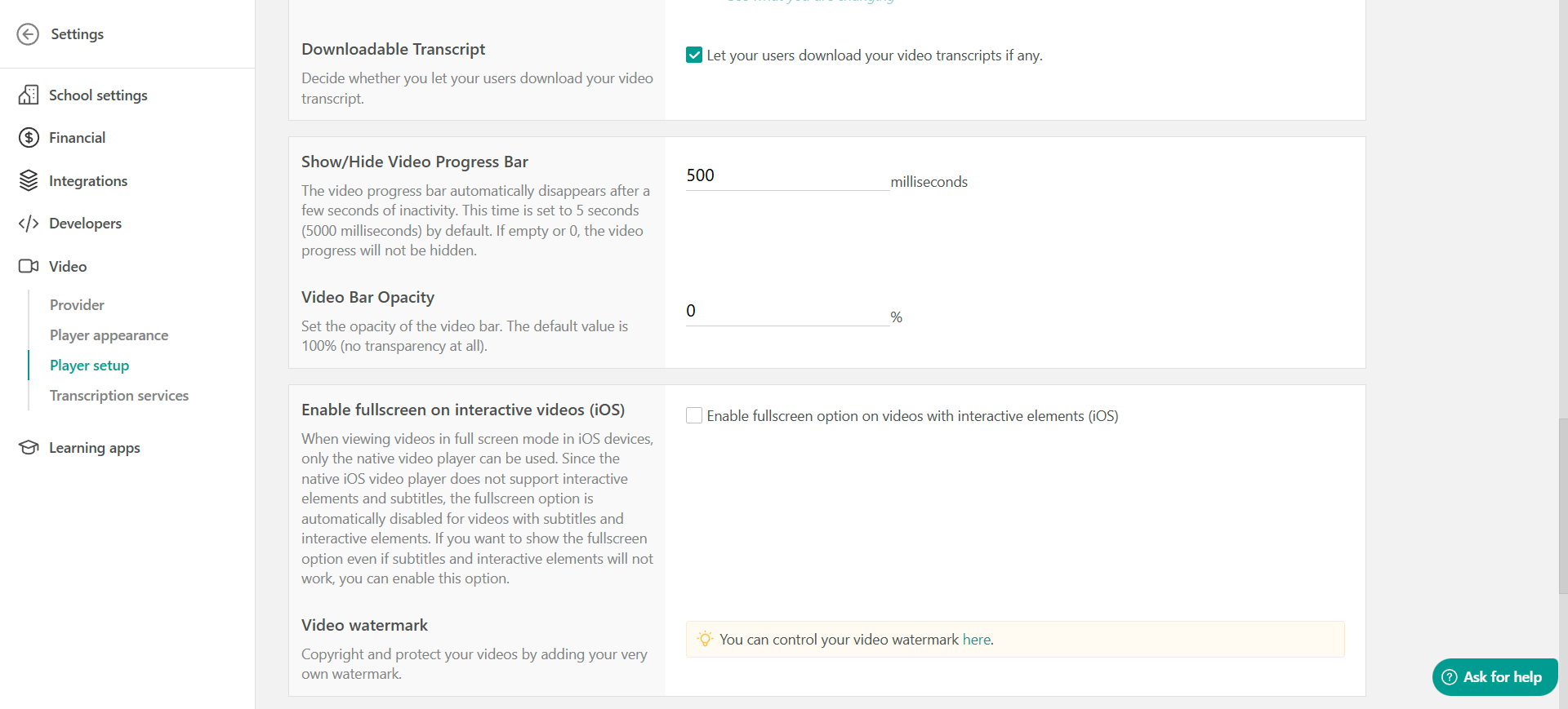 In this article, we will go through the options for setting up your school's video player, including autoplay, resume playback, progress bar settings, hiding fast forward, adjusting opacity, enabling fullscreen on iOS, and adding a watermark.