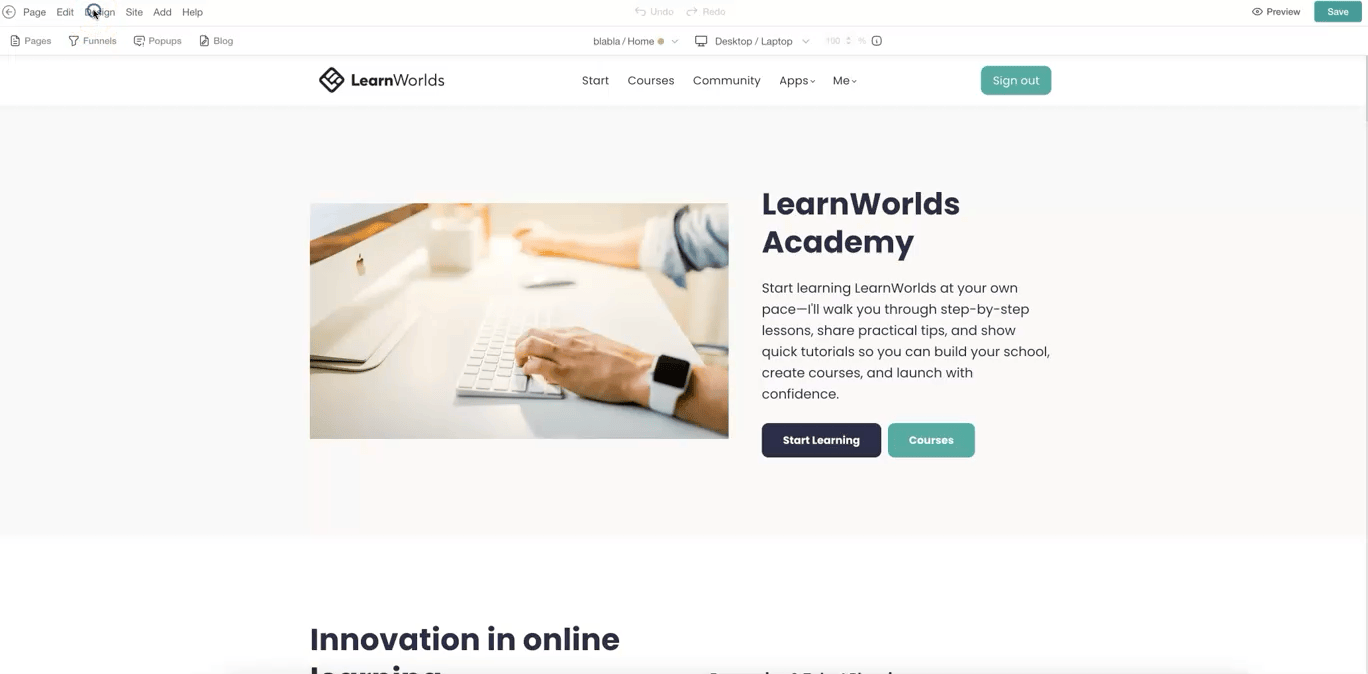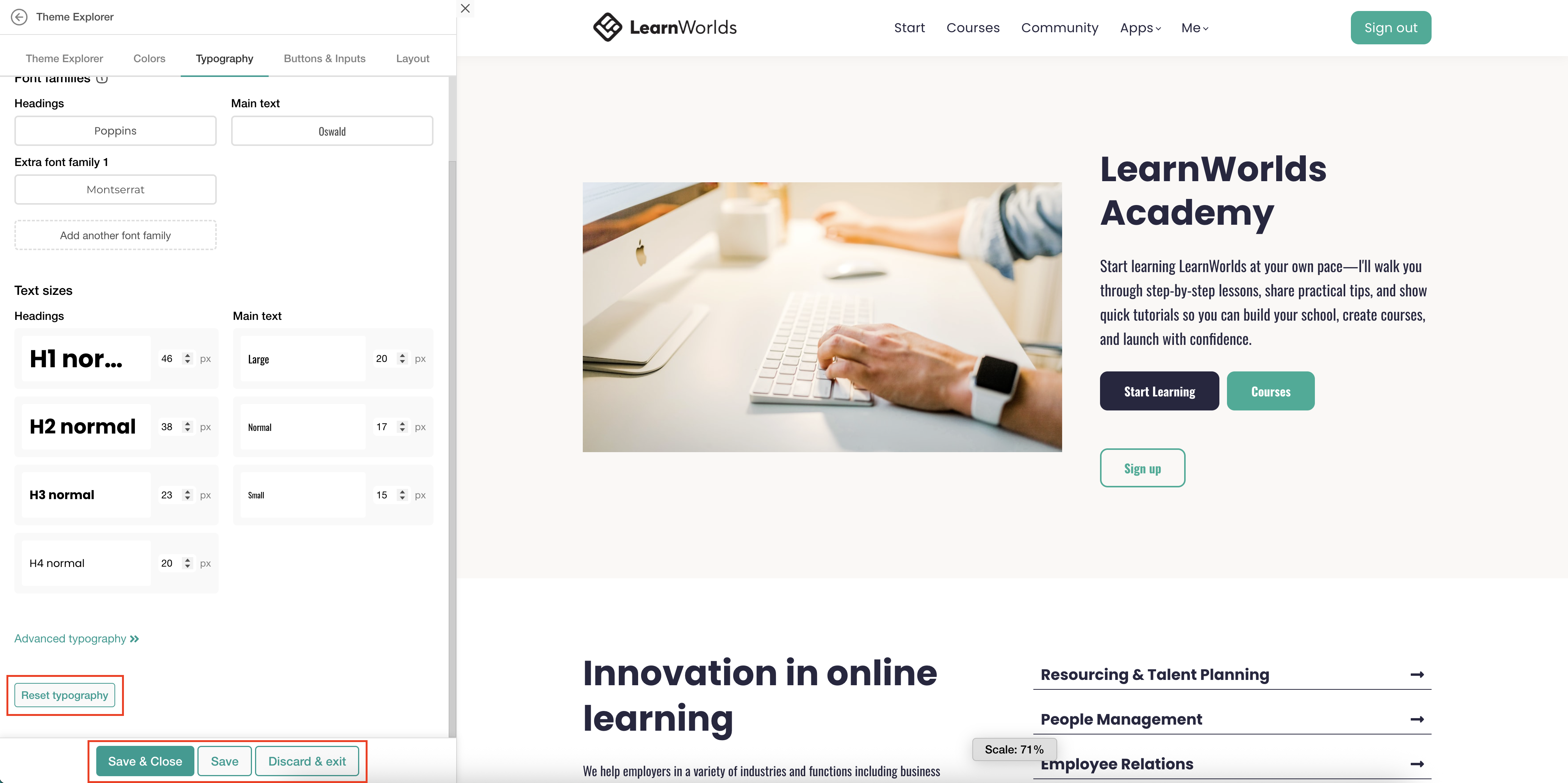 The Theme Explorer acts as your school’s command center, allowing you to select and configure your page’s Colors, Typography, Buttons, and Layouts from a single menu.