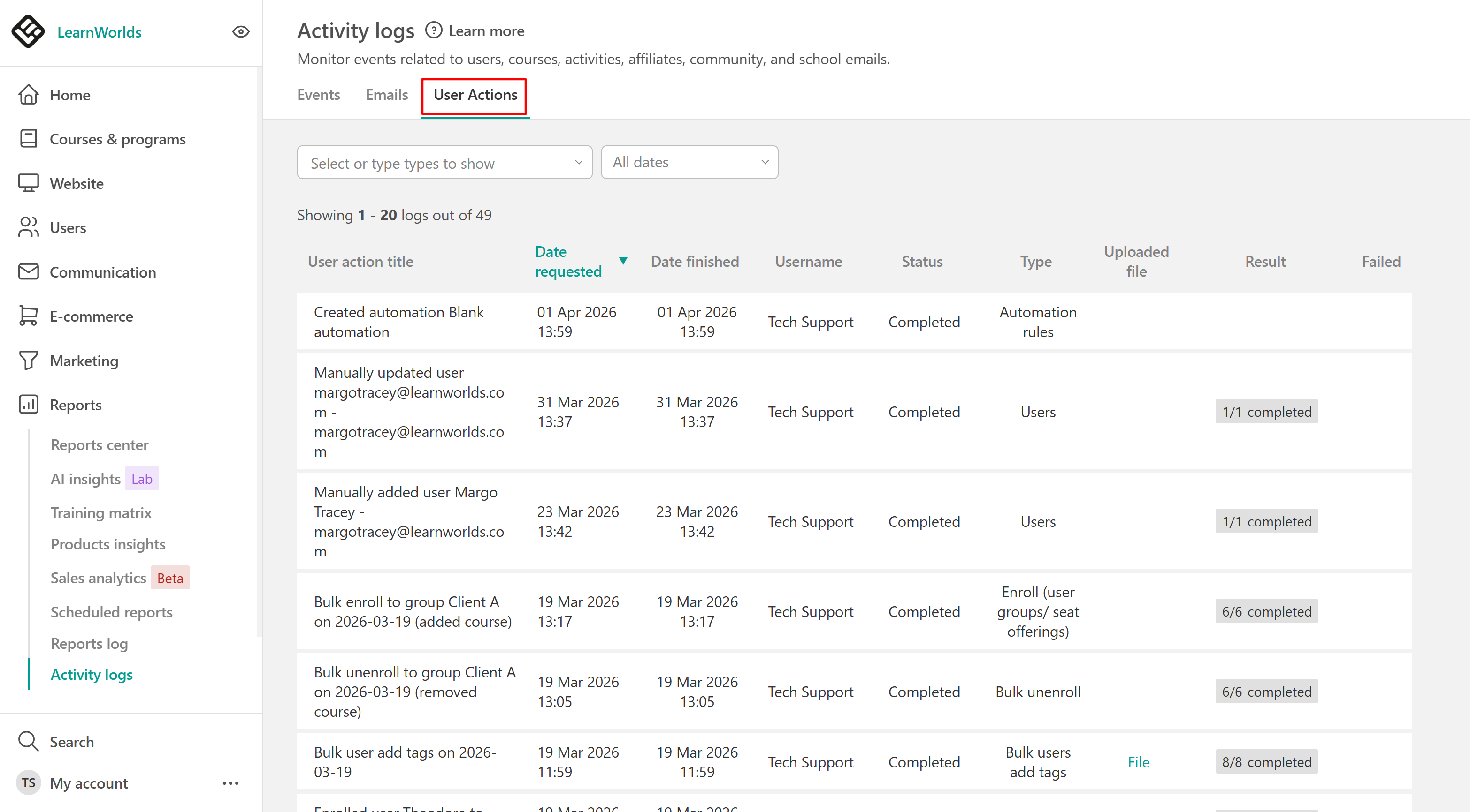 On Users Action Log, you can see a record of your Bulk actions log. Navigate to Reports → Activity logs and click on User Actions.
