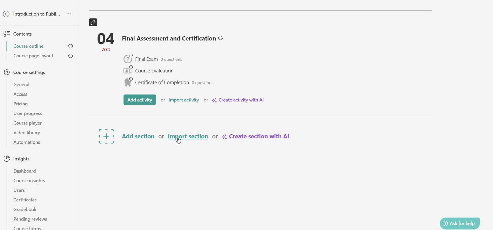 You can import individual learning activities to your created courses. On a learning activity level, click on Import activity under the desired section.