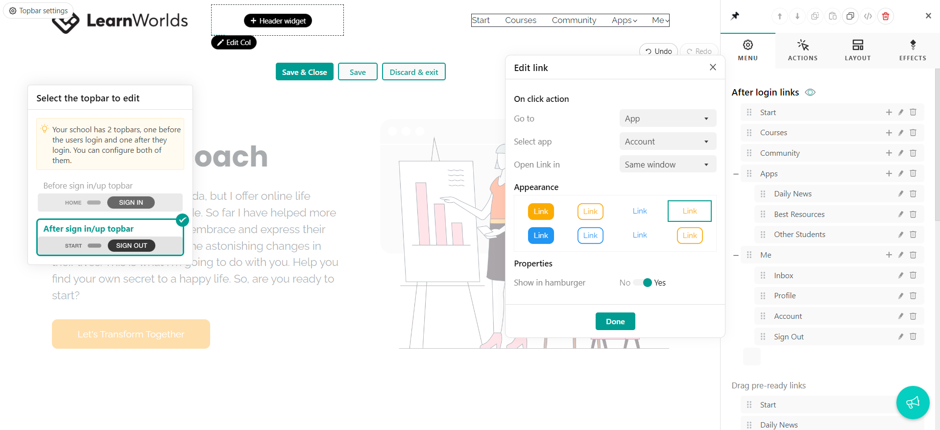Navigate to Website → Design → Edit Website, then click on Edit Page Topbar → After Sign-in/Sign-up Topbar.