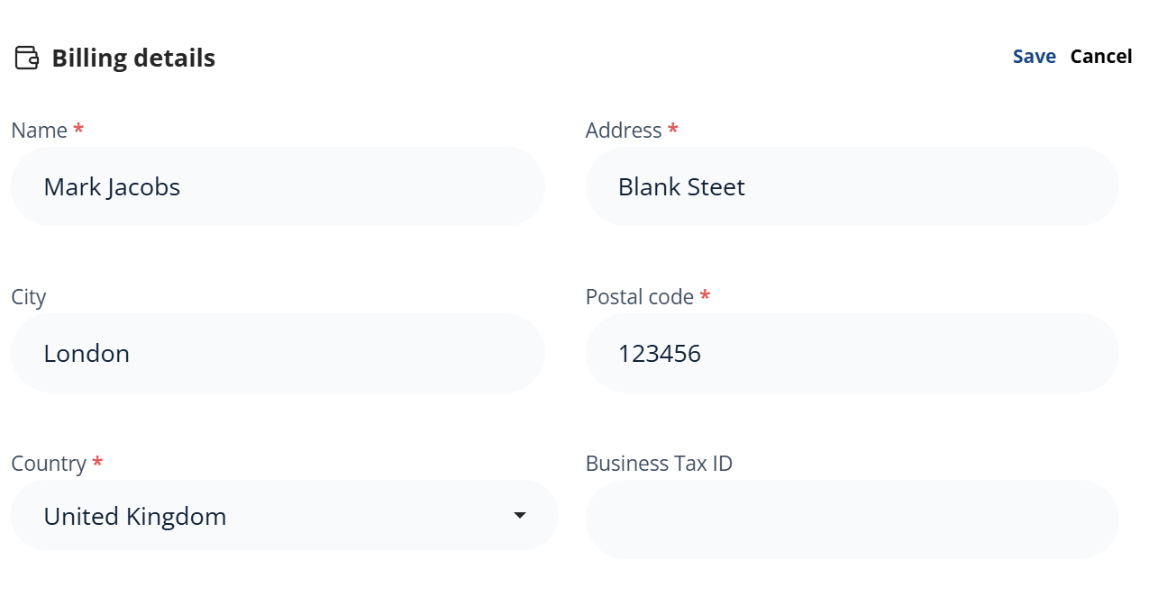 Under Billing Details, users can view and edit any billing details they have provided to you, in case you have enabled the respective option.
