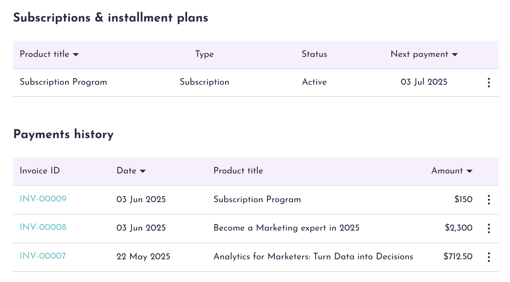 In the Payment History section, users can review details of their past transactions, including the product title, purchase date, transaction type, and amount paid. They also have the option to download invoices for their records.