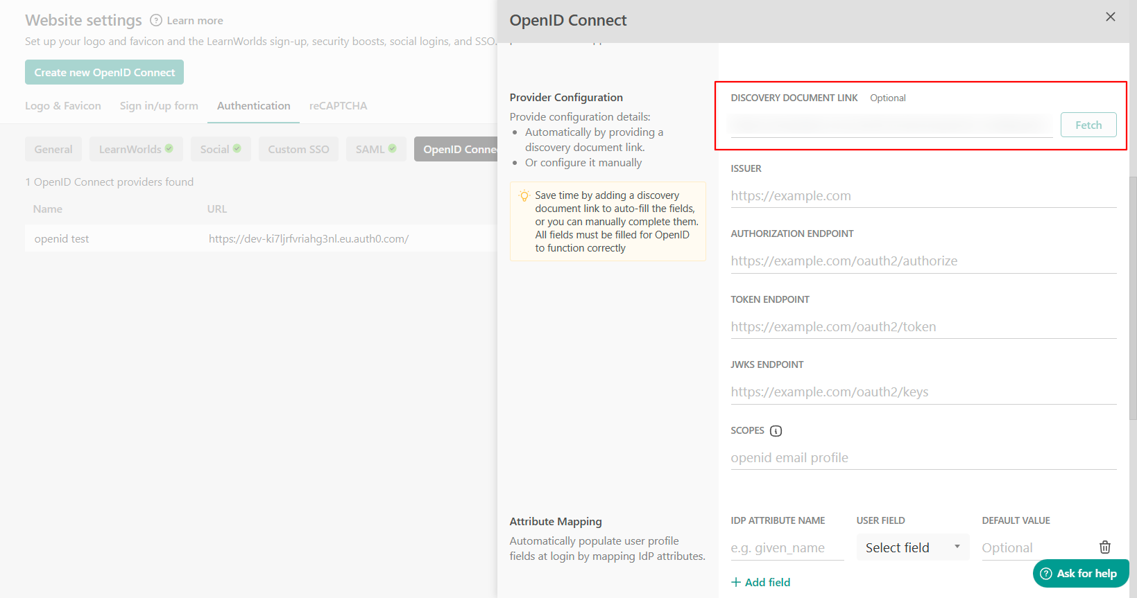 8. Paste the URL inside your LearnWorlds school into the new Open ID connect you created on the Discovery Document link field and click on the Fetch button.