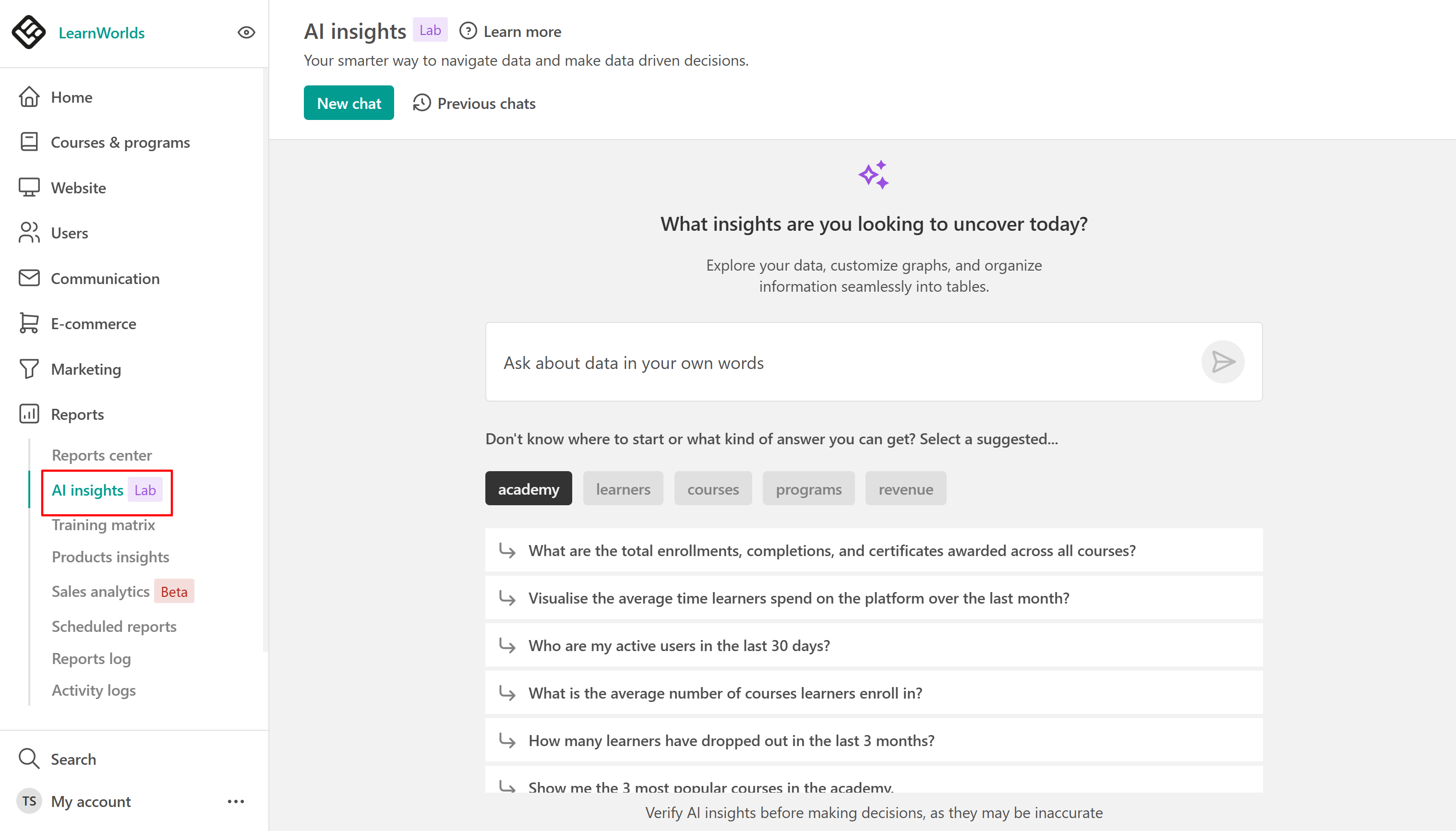 If you encounter any difficulties or have further questions about using AI Insights, feel free to reach out to our support team at support@learnworlds.com. Our team is always happy to help you make the most of your LearnWorlds experience.