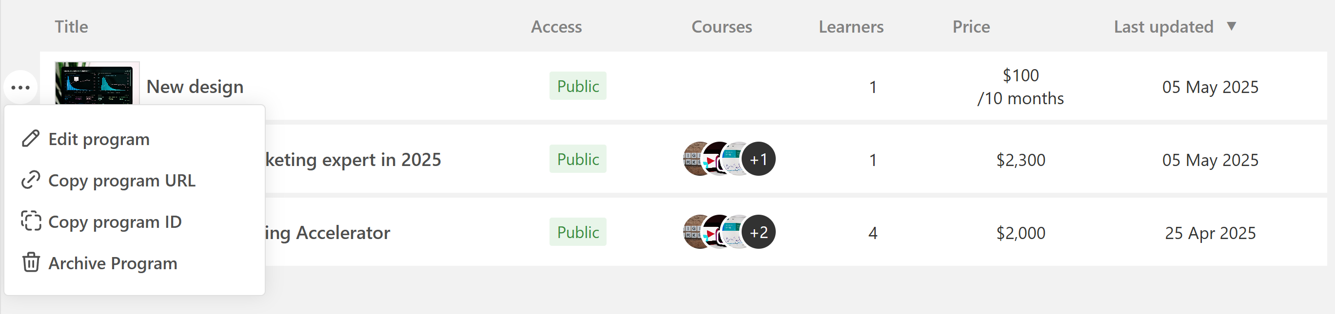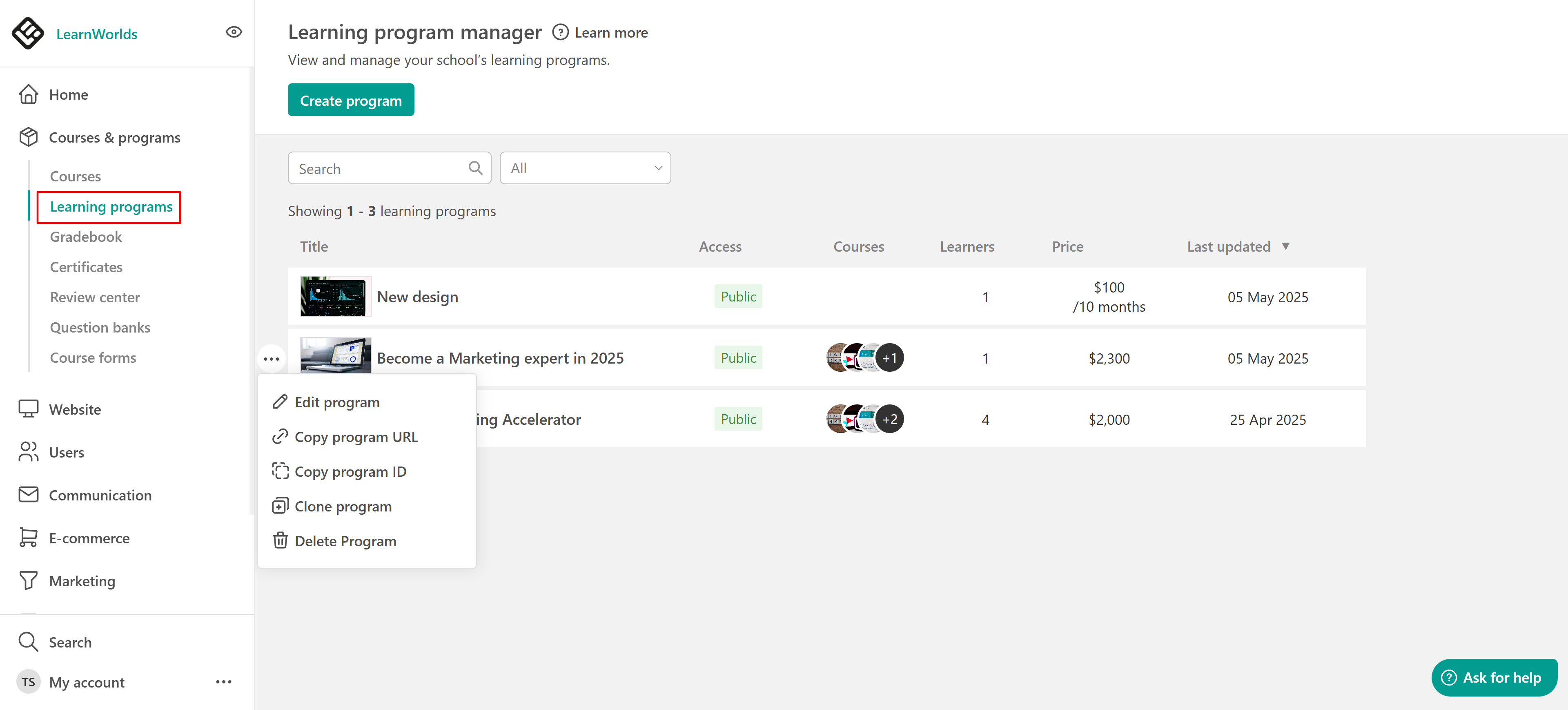 Learning Programs in LearnWorlds are structured groups of one or more courses that are sold or delivered together as a unified experience. They allow you to curate curriculum paths, combine complementary topics, or offer certifications across multiple courses.