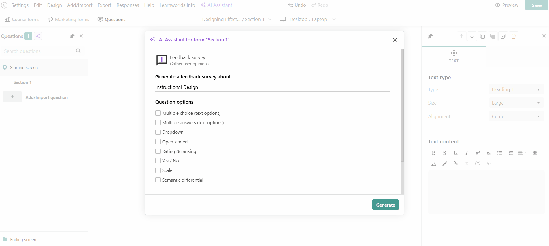 After creating your form—whether it's for a course or marketing—click the AI Assistant button to get started, or use the AI assistant icon next to "Questions" to add a new one.