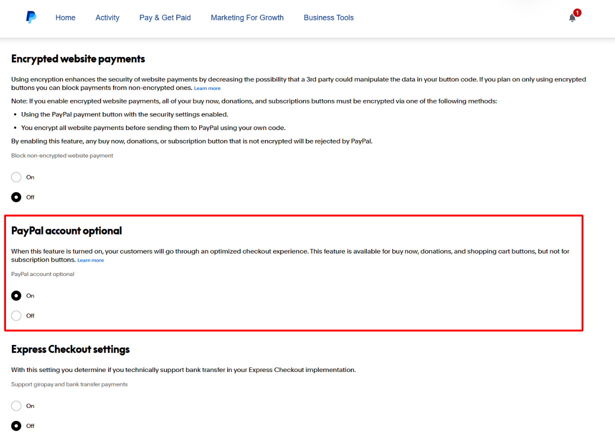 - Towards the bottom of the page, make sure that the "PayPal Account Optional" setting is set to "On".